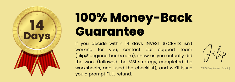 If you decide within 14 days STOCKS SECRETS isn’t working for you, contact our support team (filip@beginnerbucks.com), show us you actually did the work (followed the MSI strategy, completed the worksheets, and used the checklist), and we’ll issue you a prompt FULL refund.